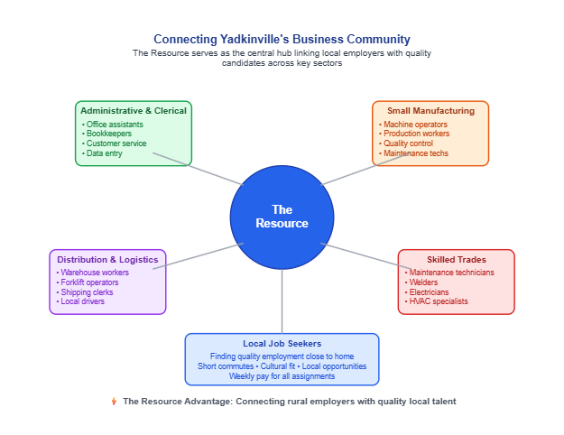 We maintain relationships with employers throughout Yadkin County and the surrounding areas, providing access to positions that may never be publicly advertised. Our network includes family-owned businesses and small manufacturers who prefer working with trusted staffing partners.